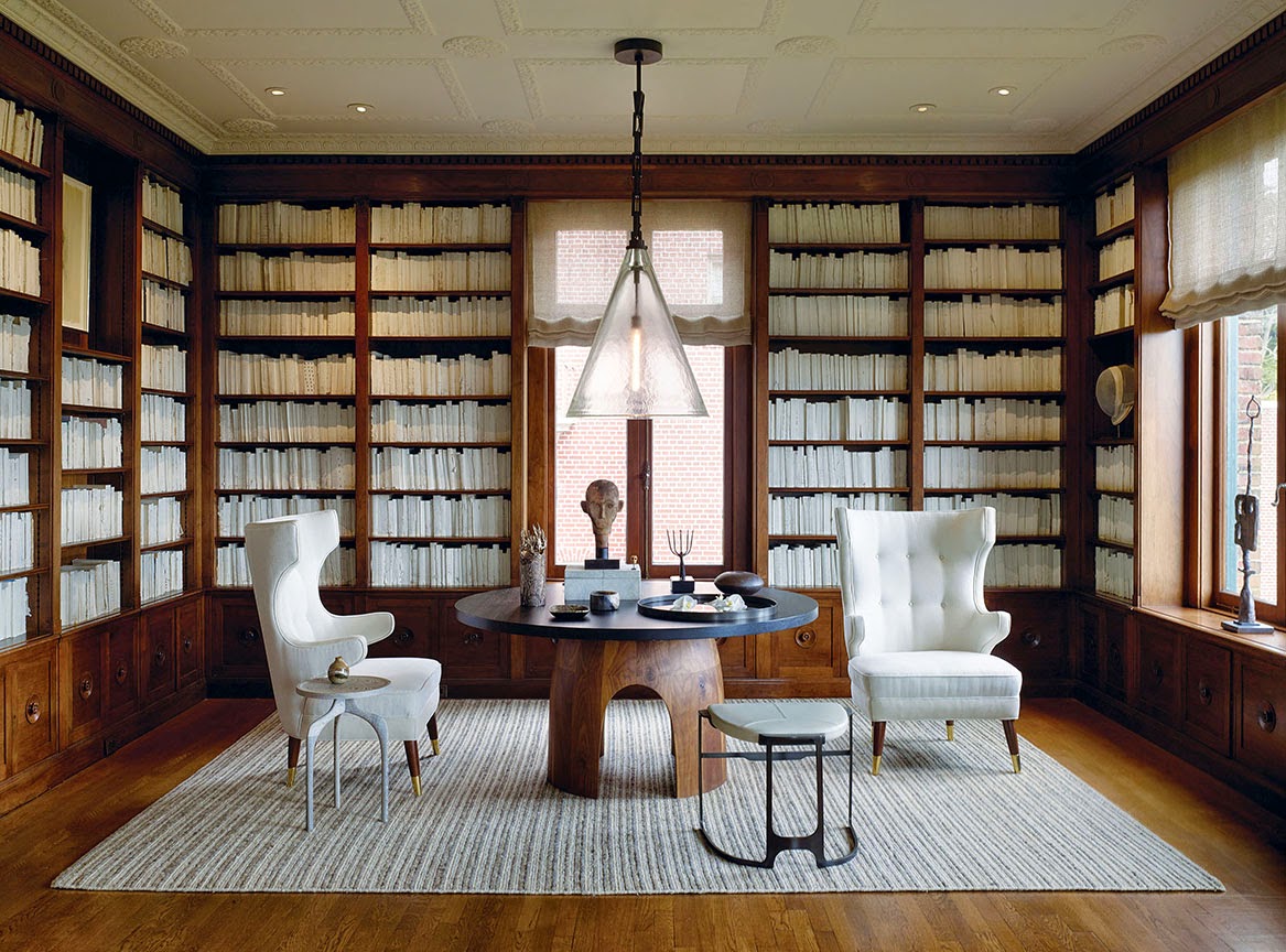 GDS: The neutral inspiration came from the room’s Classical Revival mantelpiece. I imagined a younger affluent couple appreciating the mansion’s Bliss & Faville architecture but wanting a contemporary library in which to reflect and chat and sip wine and gather the family. Ghostly pale painted volumes act as a sculptural wall covering. The detailed plaster ceiling mirrors the color of the books while contrasting with the rich carved woodwork.