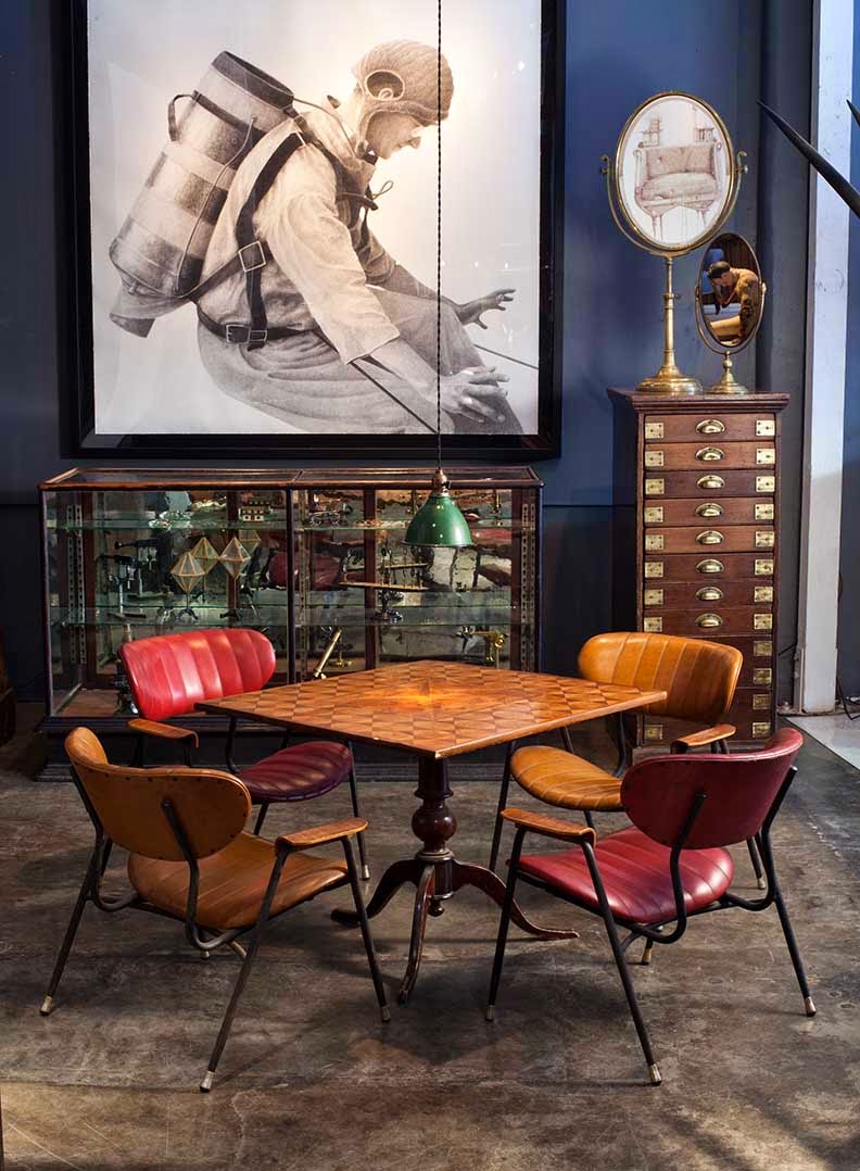 There are massive raw wood work tables from Belgium and in-their-juice century-old timber pieces Ray trucked back from France. Several pieces were found in an old building in Malibu.
