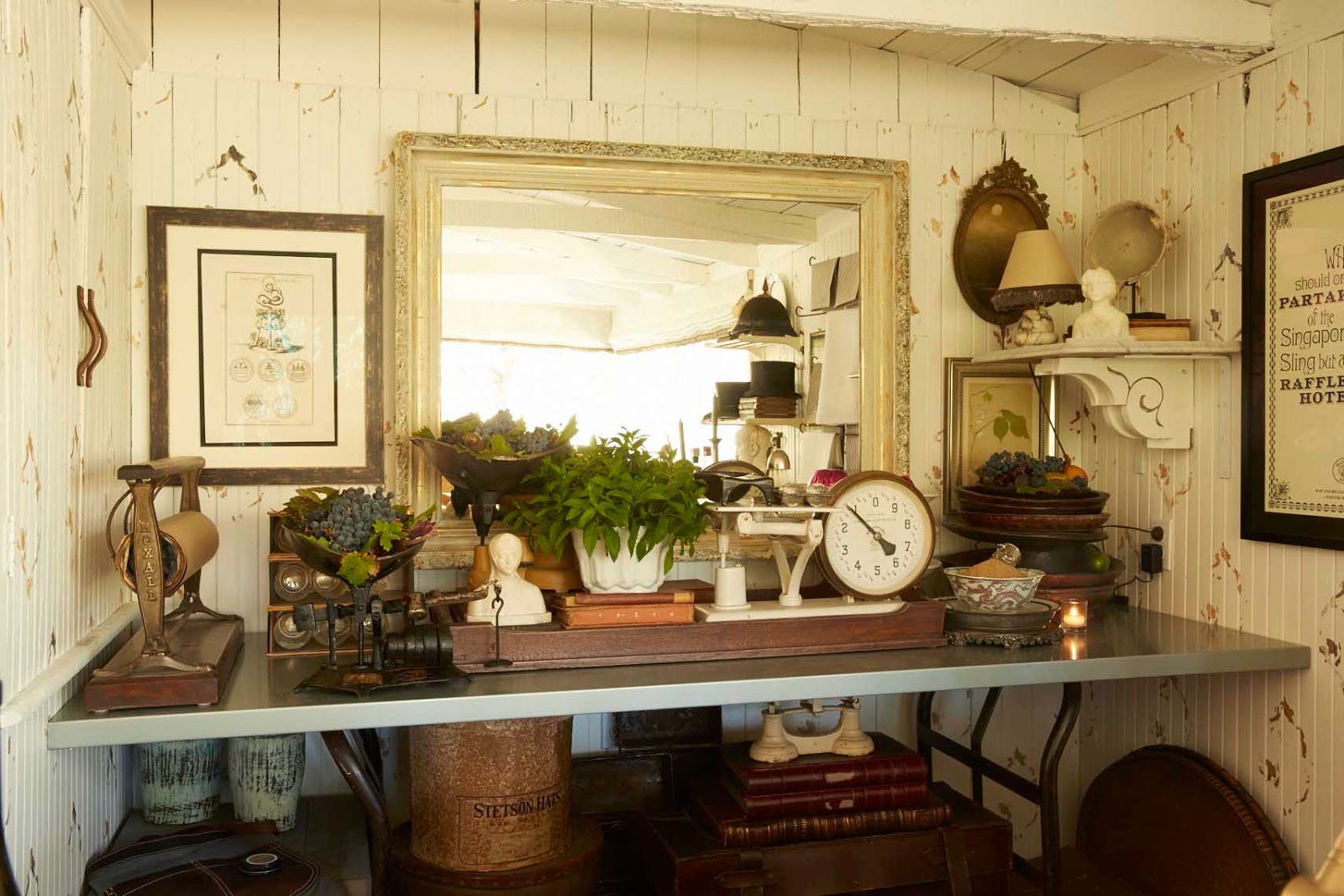 Vintage Lucite chairs cozy up to industrial spindles-turned-bistro tables whose tiered, beveled glass “trays” are perfect for tastings. The “Master” of the house has his own special seat on the pew, marked with an antique library sign, and his own special table: a Dutch Javanese Colonial antique cocktail table where his drinks are always waiting.