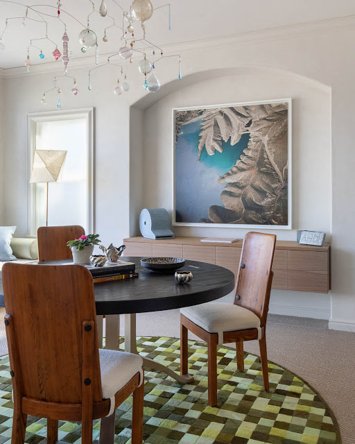 The mobile by Julia Condon adds an unexpected substitute for a chandelier providing a piece of “jewelry” in the room. The dining room becomes a sensory escape where refined detailing and materiality are celebrated, acting as a backdrop for the owner’s passion for art and collectible furniture.