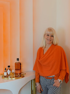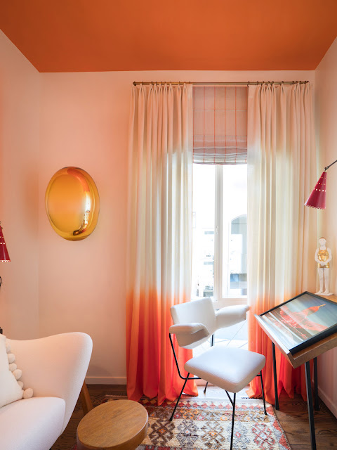 Decorative artist Willem Racké, Willem Racké Studio, and Susan Chastain of soft furnishings company Susan Lind Chastain Inc created a mid-century retreat Their bold and inventive re-design turned a former closet into a gracious office or an occasional guest room. Inspired by a graphic image from the 1960s, Willem painted the two main walls of the small room in an artful illustionist design giving the sense of looking into infinity The ground color is cream with tangerine shading.