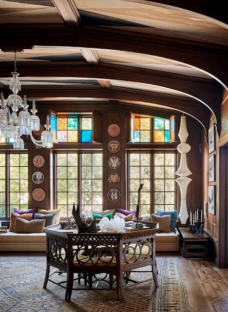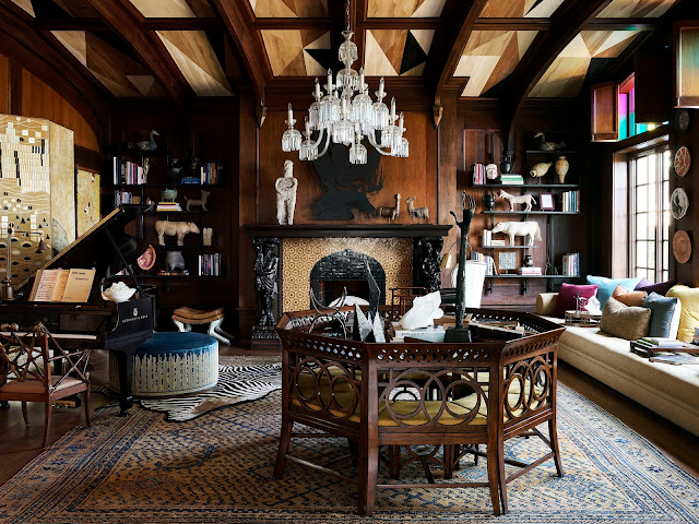 Layered in classical, contemporary, and custom furnishings and artwork, the hideaway features a statement antique Oushak carpet with an Edwin Lutyens octagonal table and chairs.