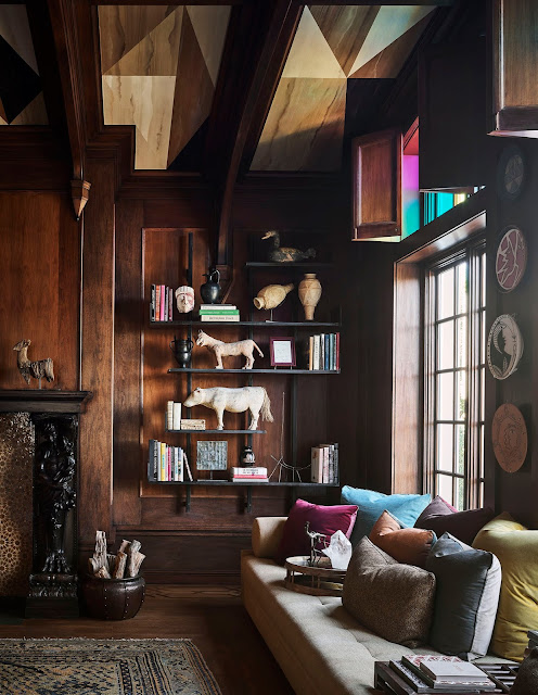 Paul and James have reshaped the room into an inspiring art-filled retreat/music room/study, rich with art collections, jewel colors, lavish textiles, and witty contrasts of materials, textures, and ideas. Hand-painted silk panels with a chic faux bois pattern add charm and interest to the ceiling beams. And Paul’s worldly collections of Han animals, sculptures, books, scrolls, paintings, and furniture (Ned Lutyens), and beautiful crafts give a sense of a multi-generation family room of cosmopolitan tastes.