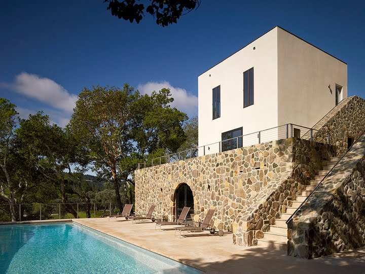 Inspiration: Early 20th-century country houses by Adolf Loos, a forerunner of rationalism and modernism. With this Healdsburg house, inspired by both Italian rustic architecture and Adolf Loos, Batey appears to have added a modern structure on ancient stone foundations.