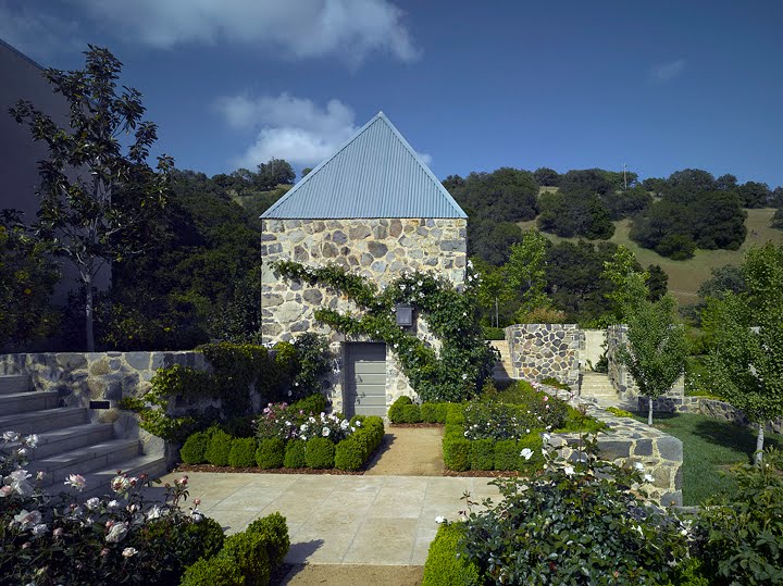 “My architectural palette consists of simple buildings and archetypal silhouettes, made of stone and classic plaster,” said Batey to me in a recent conversation. “In the wine country, I like the richness of natural stone of all kinds, for exterior walls and interior paving. I like stone rough-cut or dressed, and I specify lead shingles, bronze doors and hardware, all very traditional and elegant. I love limestone in the Napa Valley for interiors. It’s soft, pale, inviting.”