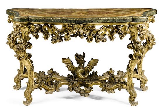 The Devonshire Borghese table, an Italian carved giltwood console table with a serpentine alabaster veneered top, mid-18th century, est. £40,000-70,000.