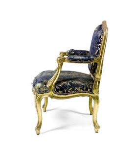 One of six carved giltwood fauteuils, Louis XV, mid-18th century – covered in original blue and gold silk lampas from the Bachelor Duke’s Crace refurbishment, est. £18,000-25,000
