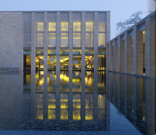 We turn from Lodhi Road into the monumental stone territory of the Aman New Delhi.