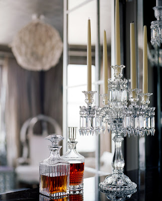 As a final touch, the ceiling was given a silver-leaf finish, so that the whole room appears to float. It enhances the couple’s Baccarat collection of sconces, lamps, torcheres, decanters and wine glasses, a pure example of modern French style.