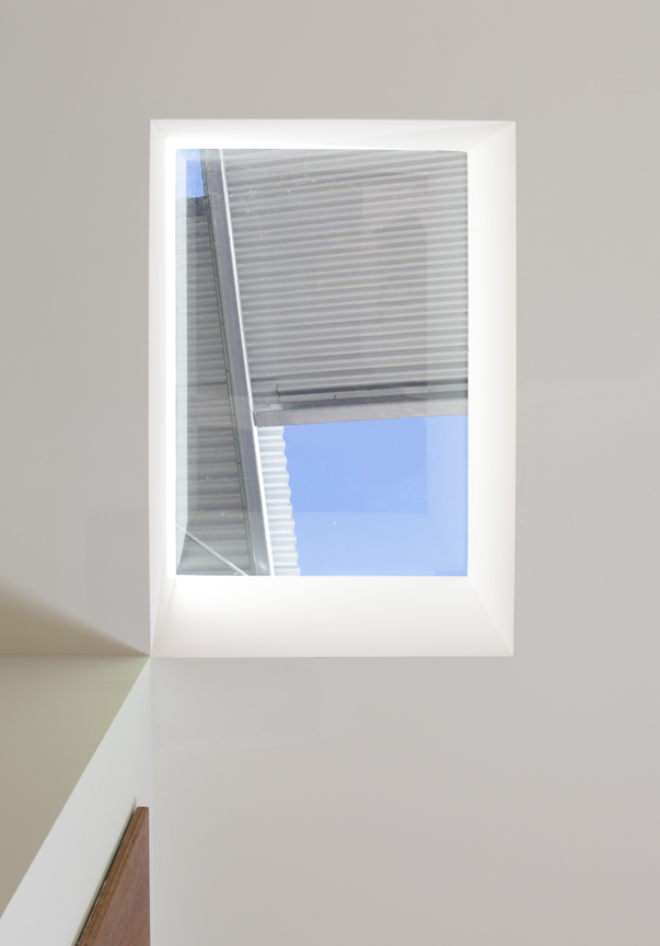 Rectangular cutouts in the roof create patterns of sun and shadows onto the cabin roofs and the landscape. They also align with skylights in the cabins so the sky can be viewed from the live/work spaces.