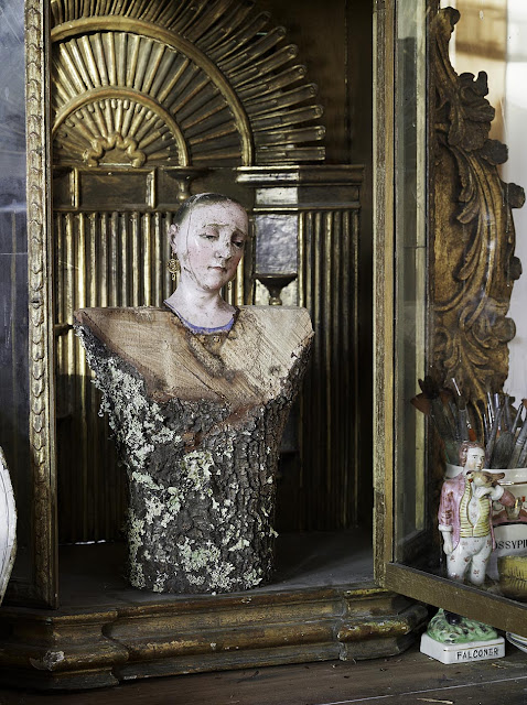 | An architectural fragment plays stage for vintage albums and a Chinese birdcage. |