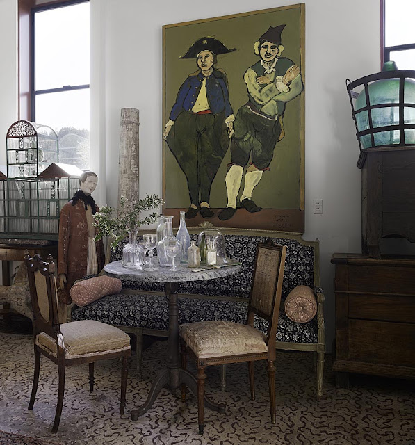 | A painting by Yeager hovers above a marble-topped French table topped with crystal. |