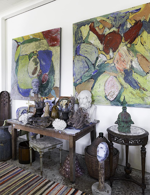 | In the studio, new painting completes, amid a certain orderly chaos. |