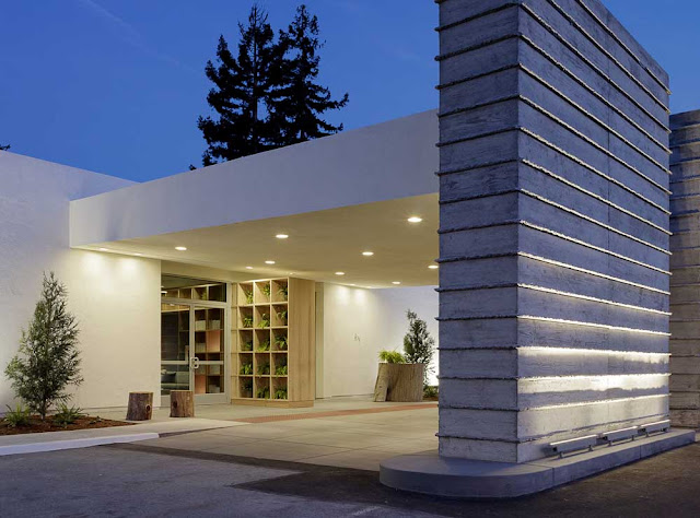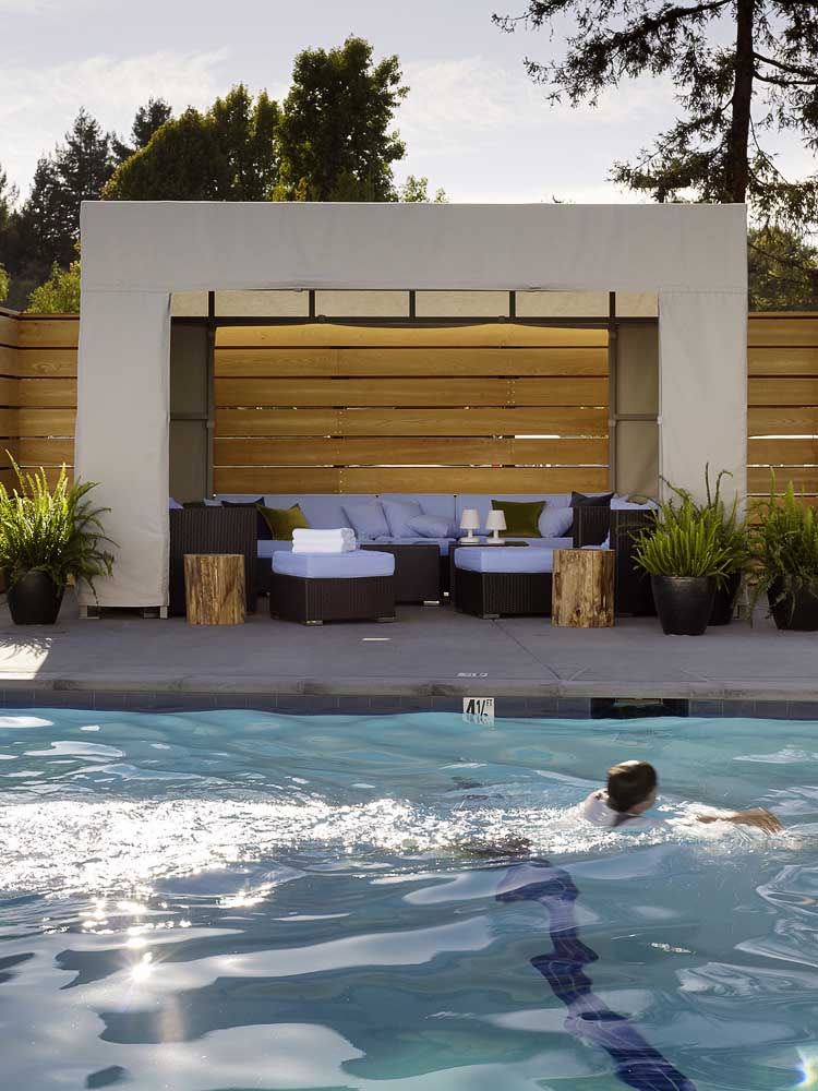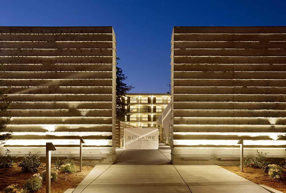 The decision was made to juxtapose the pure lines of the buildings with the raw beauty of redwood trees and weathered wood. Thus Hotel Paradox.