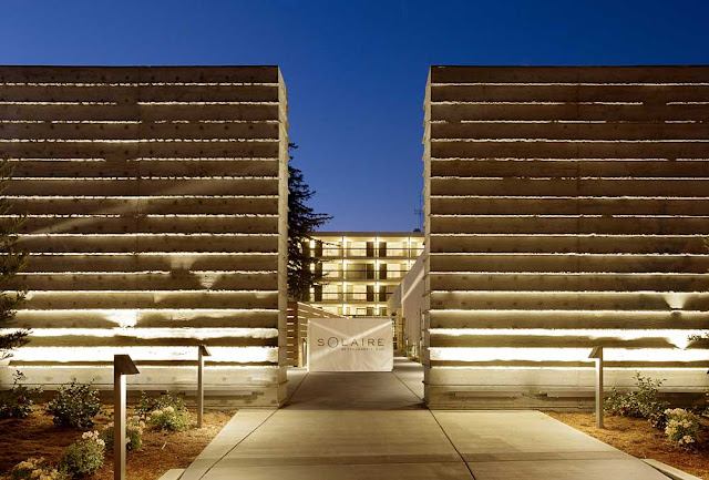 The hotel consists of a five-story guest accommodation building (one of the tallest in Santa Cruz) and an adjoining single-story structure with the reception area, a gallery, conference rooms, and Solaire, the restaurant/bar and lounge.