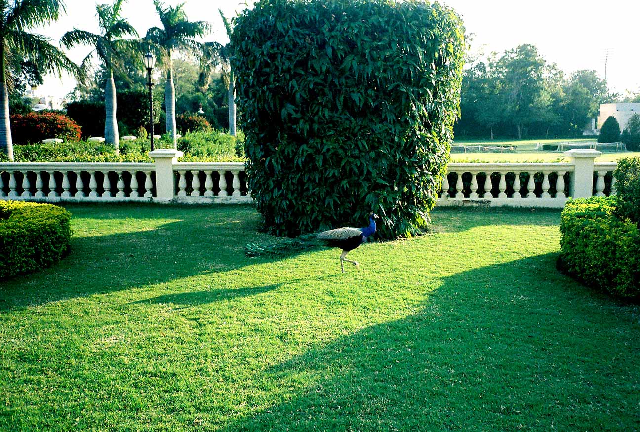 Yes, the hotel is palatial in a Moghul way—but my favorite rooms are rather understated. I like one because it has access to a terrace overlooking the garden. I like another because the sitting room/ bedroom/ dining room is decorated in Anglo-Indian style, with a black and white marble floor, pale off-white walls, portraits, and carved mahogany furniture. It’s low-key and elegant, not especially glittery.There is also the Peacock Suite (which I love), which overlooks the garden where peacocks preen and stalk about, and even perch on the terrace.