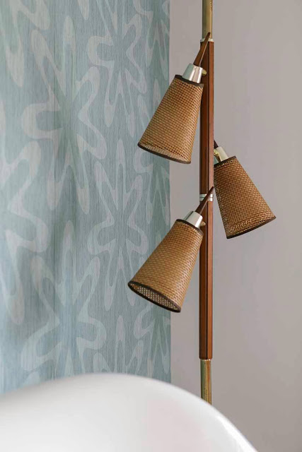 Living Room:  Custom chairs and tufted sofa by Brian Dittmar Design are covered in contract-grade fabrics by Kravet (ideal as this is also a vacation rental property). The accent wall is covered in Omexco’s boomerang print grasscloth. The tension lamp (found on ebay) and the chunky bamboo glass coffee table (found at Misty's Consignments, www.mistysconsignments.com) are both vintage; the white molded fiberglass chaise is a reproduction Charles and Ray Eames ‘La Chaise’.