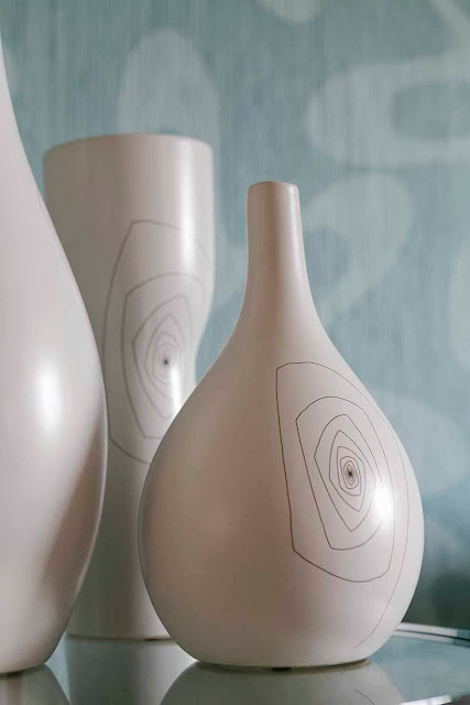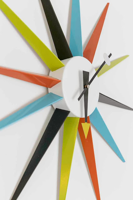 Dining Room:  The walnut pedestal dining table is from AllModern.com surrounded by Verner Panton molded plastic chairs in white. The chandelier is the "Coral" pendant by David Turbridge. Metal wall hanging is vintage Curtis Jeré found at Misty’s Consignments (www.mistysconsignments.com).