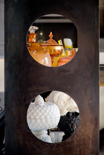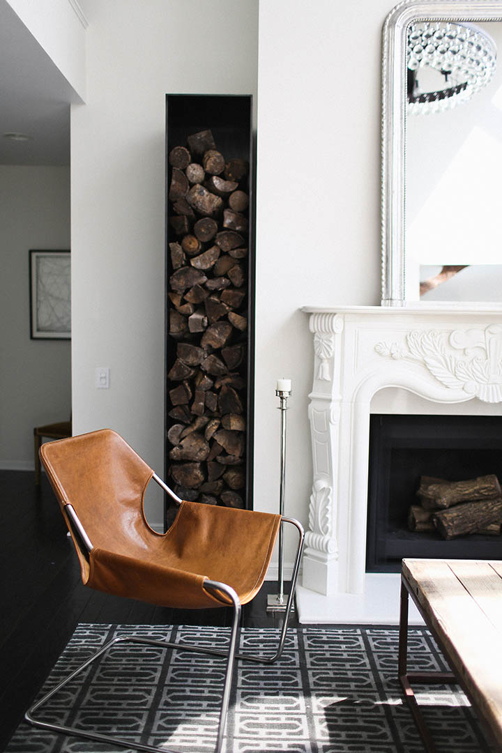 Adjacent is an oversized, floor-to-ceiling rolled steel log holder custom-crafted piece by Ferrous Studios.