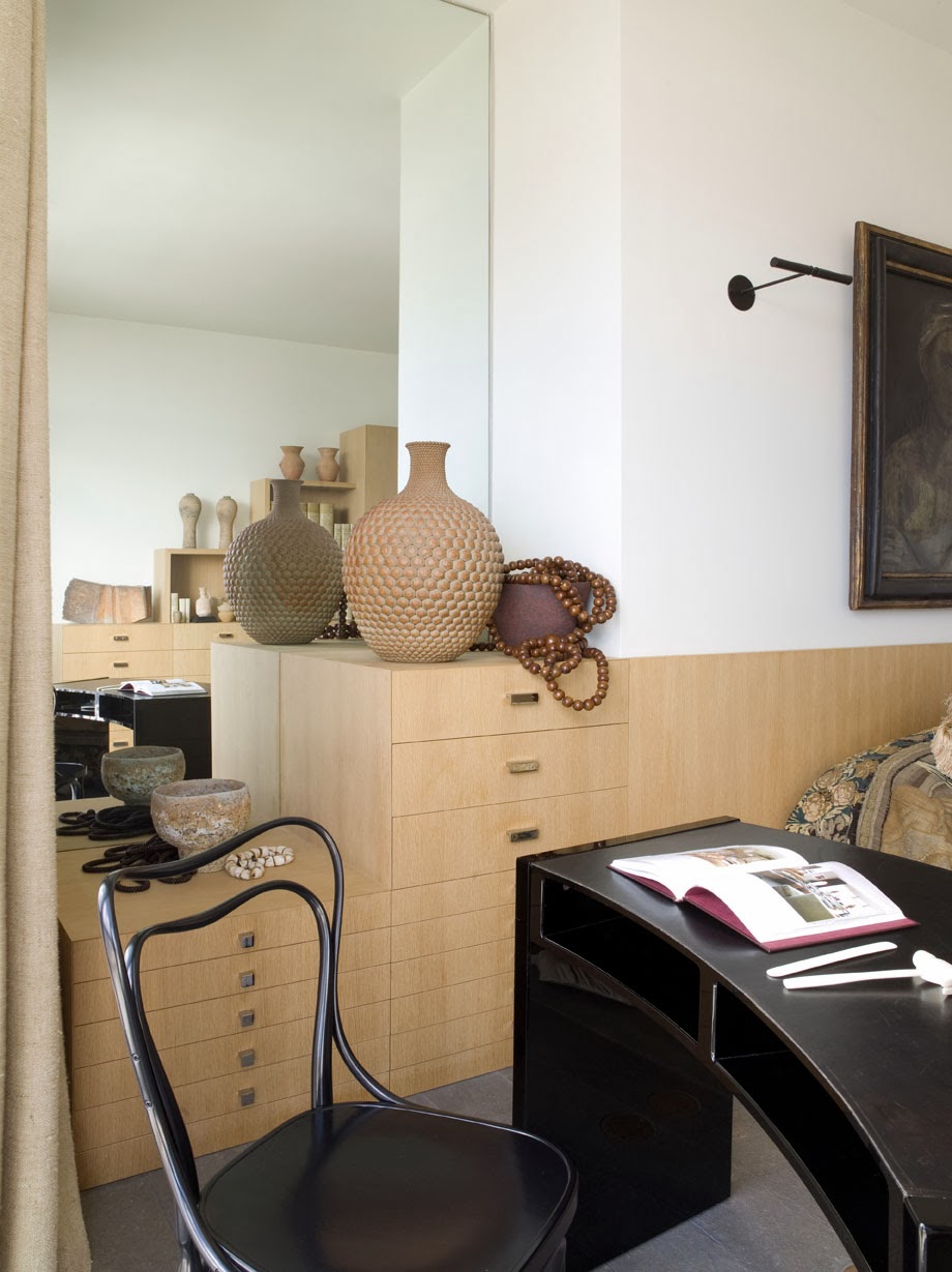 Photographs above, by Jean-Michel Sordello, show Martin Muller wearing a bespoke seersucker suite in his favored Belles Rives suite, #67, with is favorite desk arranged with his books, watercolors, inks, brushes, pens and pencils—and post cards ready for collaging, painting, and stamping.