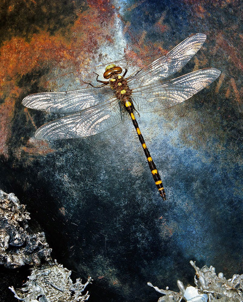 Butterflies, beetles, dragonflies and other colorful insects take center stage in this collection of Jo Whaley’s photographs.The photographs show insects in altered habitats that reflect a compromised natural environment. Entomology specimens are juxtaposed with backgrounds which are composed of cast-off materials from urban production, which have partially been reclaimed by nature; such as metal that is rusted, paper that is foxed by microorganisms and plastic pitted by the sea. The result is a world of nature, intermixed with the man in manufacture, and the melancholy beauty of entropy.
