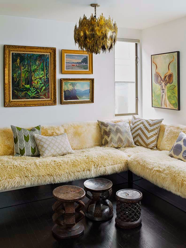 She deftly juxtaposes textures and finishes, including the contrast of African tribal carvings with seductive sixties Carlo Ponti curves.