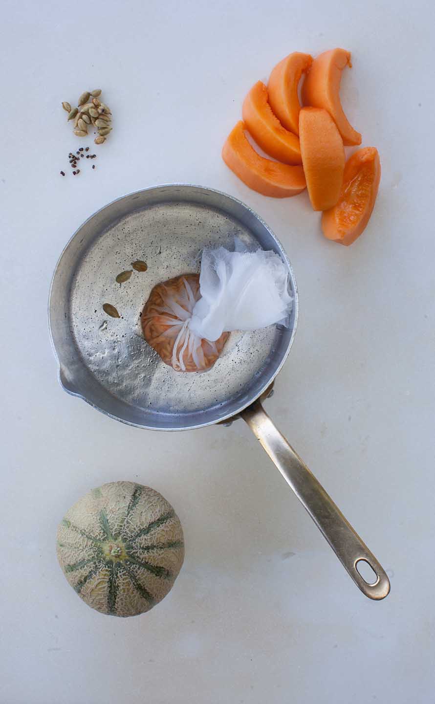 DDLF: With the recent heat wave it has been a time of peaches and melons. White peaches served as finger food, doused in olive oil, fleur de sel and grappa. And/ or used to garnish bicycle cocktails: peach, borage, ice, a blush of Campari, all topped up with crisp and demonstratively dry white wine. Chilled melon and cardamom soup is another hit this time of year. I just served this to a hundred mouths all gathered to toast the fashion designer Haider Ackermann and jewelry designer Harumi Klossowska. You will find all of the above recipes in the book.