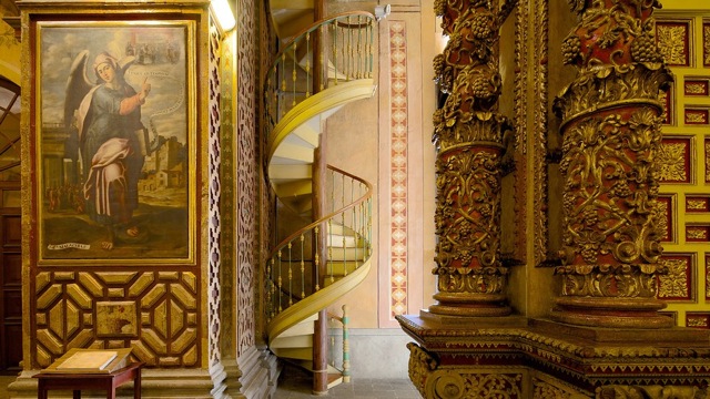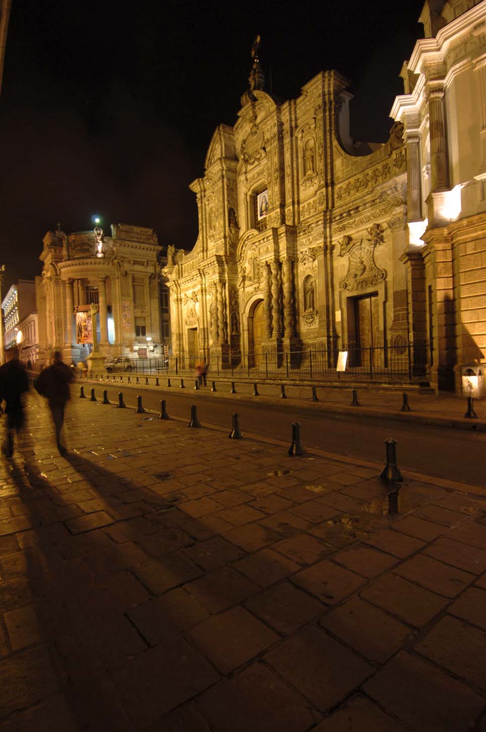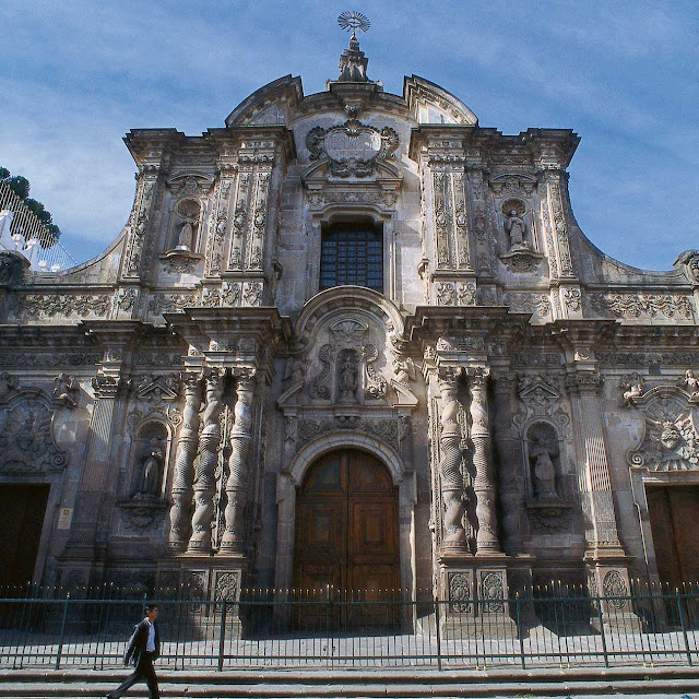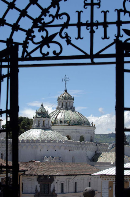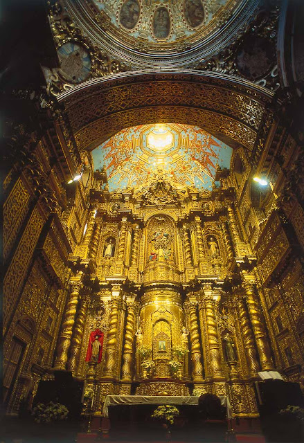 In the church interiors, hundreds of portraits, sculptures, odd stairways, Saracenic carving, Moorish arches, niches, domes, chapels, volutes, architraves, articulated frames, polychrome, transepts, Mudejar characteristics, angels, nuns, gargoyles, saints, floreate corbels, and pulpits and knaves and aedicules were all painted and slathered in thick gold layers. Much of it is by Ecuadorian artists. Dazzling. Hallucinogenic. Dizzying. The eye is traveling, indeed. I’ve never seen church interiors so intensely embellished.