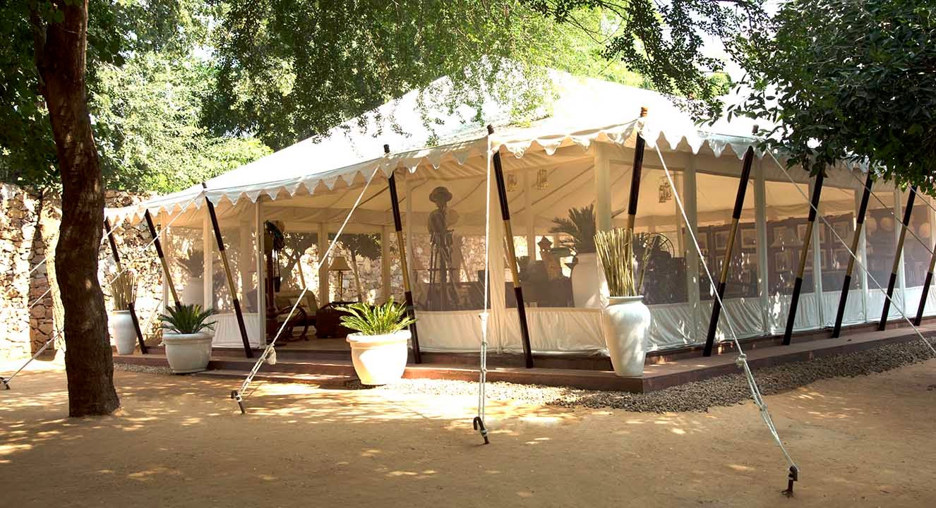 The tents are incredibly comfortable and have the soothing scent of traditional sea-grass matting. Furniture is traditional Anglo-Indian campaign/safari camp style, complete with rosewood desks, teak campaign chairs, and a library stocked with books on Indian birds, and volumes on tigers, northern India, Rajasthan, the Maharajahs, and the wildlife of Ranthambore.