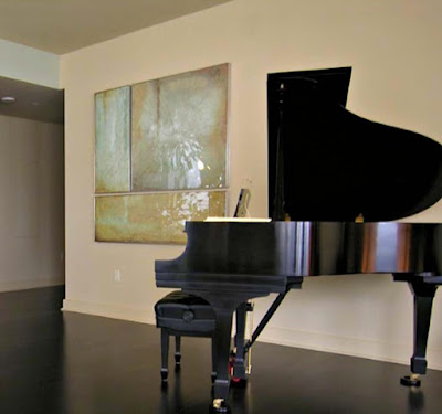 Brian Dittmar, a noted interior designer in San Francisco, has been the art director of THE STYLE SALONISTE since Day One—almost seven years ago. Brian introduced me to his dear friend Cassandria Blackmore about five years ago when he was scouting for and decorating her chic new studio in Pacific Heights, San Francisco.Brian has acquired many of Cassandria’s paintings for his clients — and he prizes the Cassandria painting that has pride of place in his living room, above. That’s his beloved pug, Freddie, stealing the limelight.