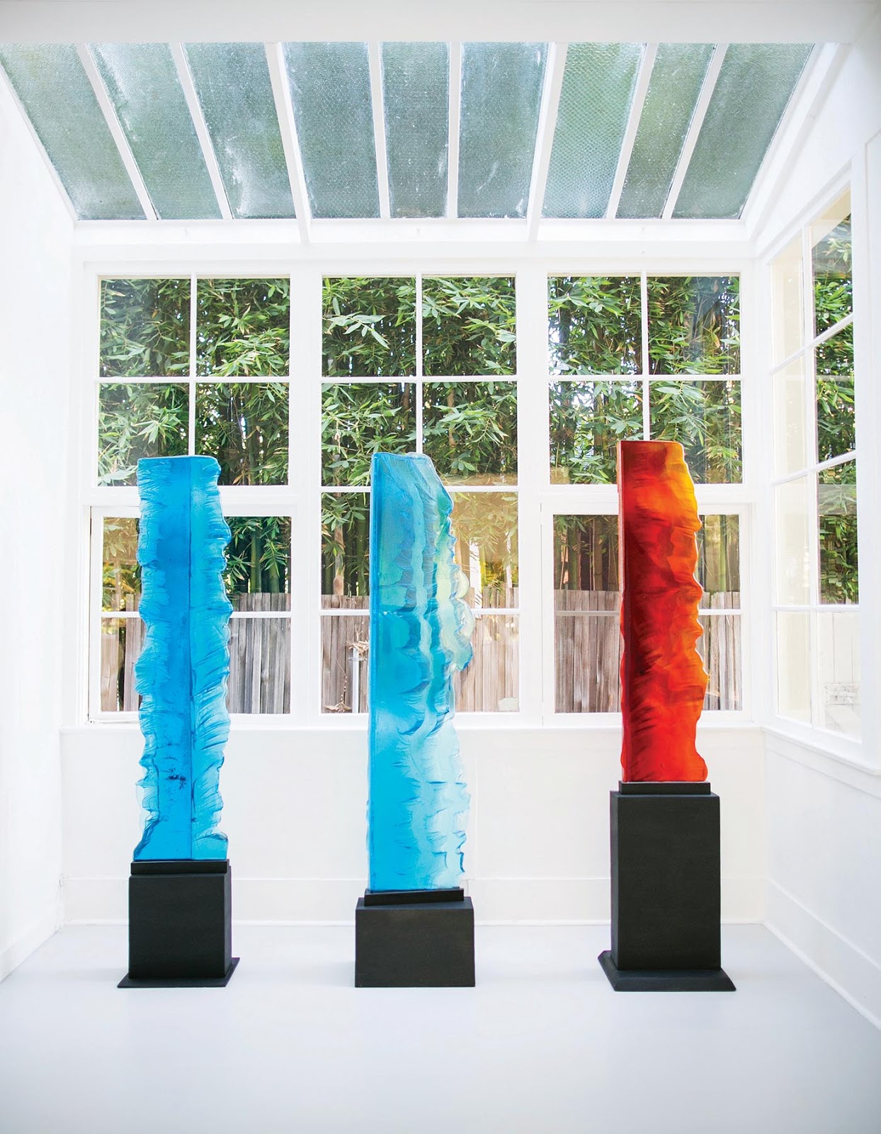 BD: Yes, in 2010, while she was still living in Seattle, Cassandria decided she should open a storefront studio in San Francisco. I helped her scout locations. A small space on the once-shabby end of Fillmore Street in Pacific Heights suited her needs and the lease was signed. Cassandria and I then began transforming the downtrodden space into a clean and crisp white box in which to display her vibrantly colored shattered glass pieces. The walls and ceiling were painted as white as white can be (a custom mix by Benjamin Moore) and the existing concrete floors (exposed once the ugly laminate flooring had been removed) were stained a rich gray. The store front was painted with a special zinc-based paint that weathers to a rich deep bronze. Since opening her studio, that block of Fillmore Street has been energized with quite a few new stores and restaurants.