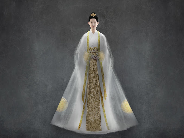 His colors include crimson and emerald for the lead characters, infused with transparency and lightness to enhance the mood. Yip dreamed up bold armor and graphic costumes for the men.