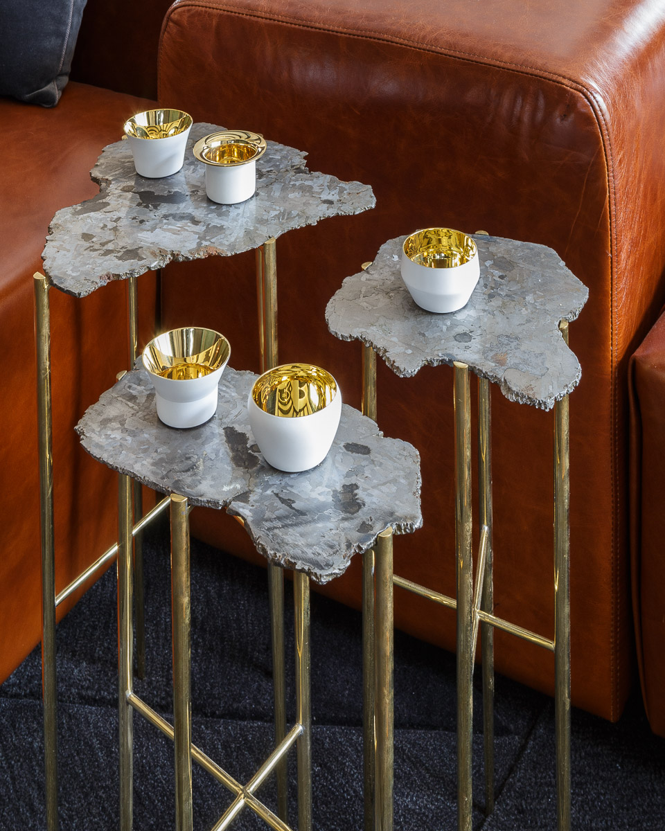 Trio of meteorite slab tables with copper legs, Coup d’État