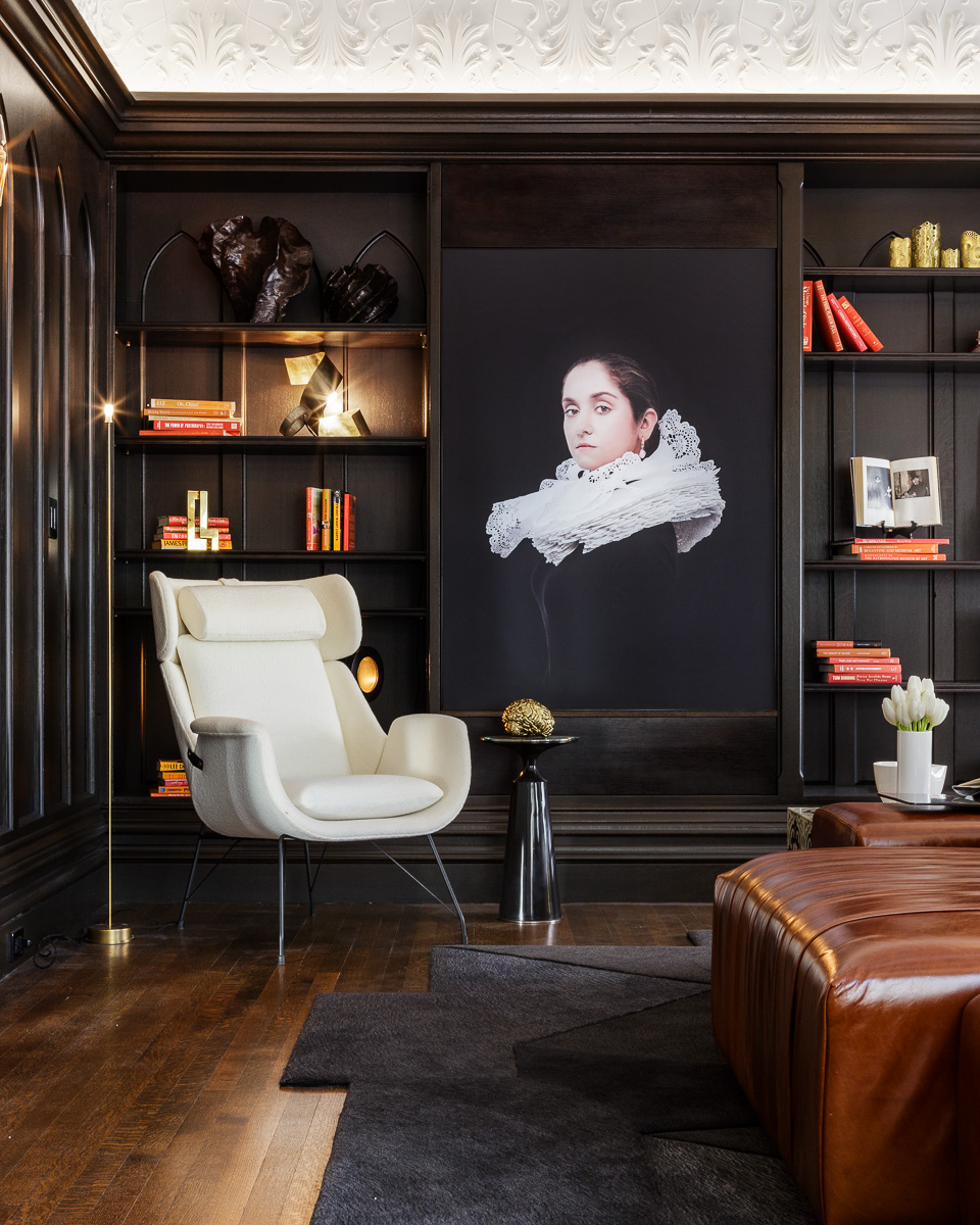 His chiaroscuro effects feel both coolly contemporary and the legacy of a golden age. He added new plasterwork, darkened the mundane wood paneling to add a layer of chic. With a pair of shimmering lights whirling overhead, the room feels entirely contemporary, with corners and images and lighting and leather to be enjoyed and discovered. Kobus called it Bibliotheek, the Dutch word for library, but it is so much more. It is now a room for entertaining friends, a quiet place for reading and study, and a setting to frame and display art, books and mysterious objects. Perfection.