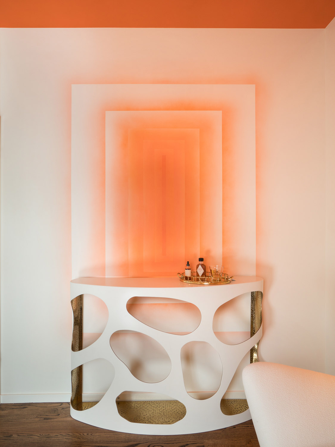 Decorative artist Willem Racké, Willem Racké Studio, and Susan Chastain of soft furnishings company Susan Lind Chastain Inc created a mid-century retreat Their bold and inventive re-design turned a former closet into a gracious office or an occasional guest room. Inspired by a graphic image from the 1960s, Willem painted the two main walls of the small room in an artful illustionist design giving the sense of looking into infinity The ground color is cream with tangerine shading.