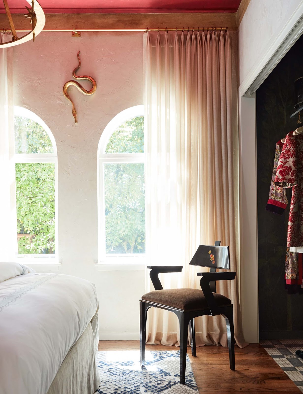 The watchful eyes of ceramic snakes, created by San Francisco local artist Linda Fahey, above the bed, fend off bad spirits.