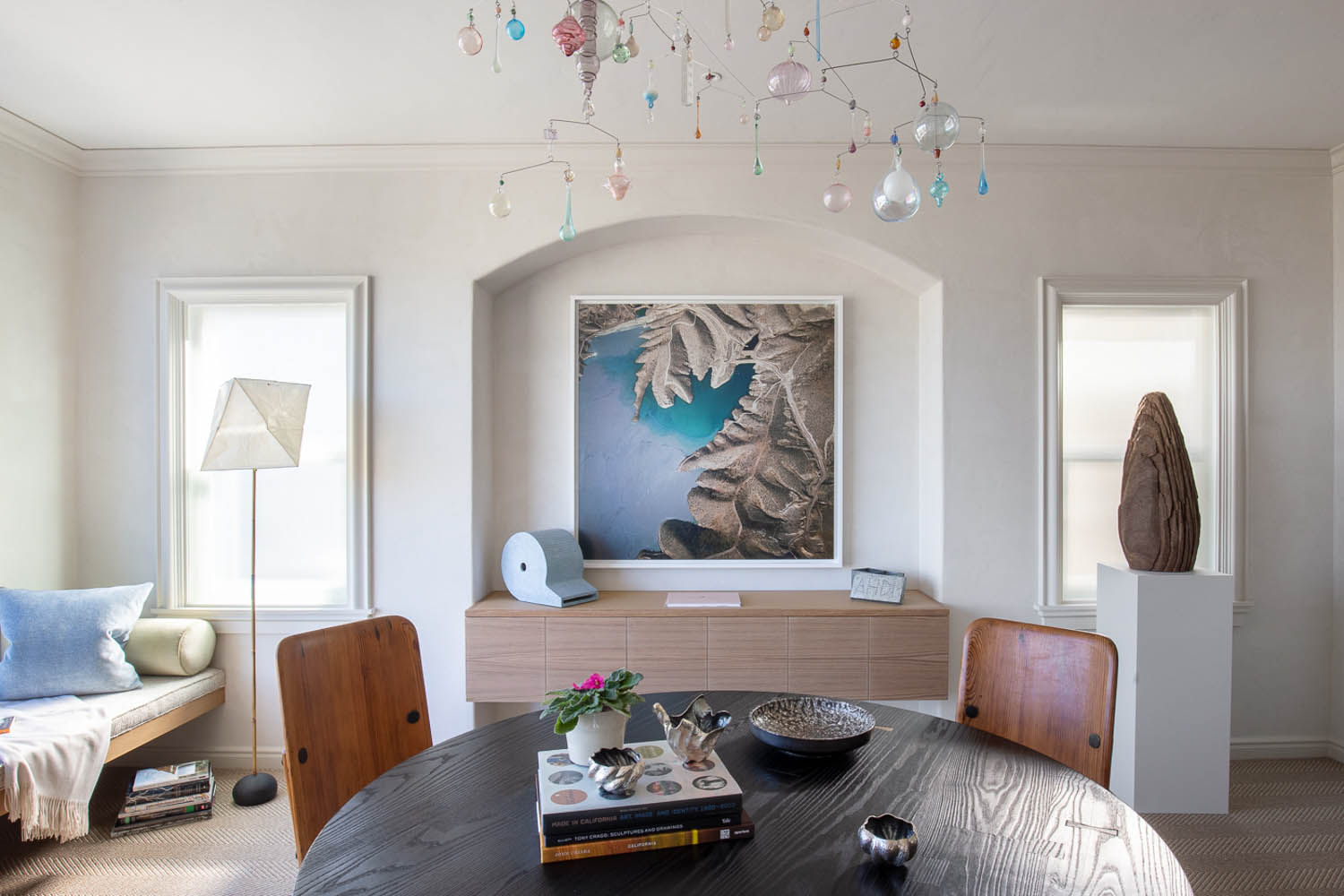 The mobile by Julia Condon adds an unexpected substitute for a chandelier providing a piece of “jewelry” in the room. The dining room becomes a sensory escape where refined detailing and materiality are celebrated, acting as a backdrop for the owner’s passion for art and collectible furniture.