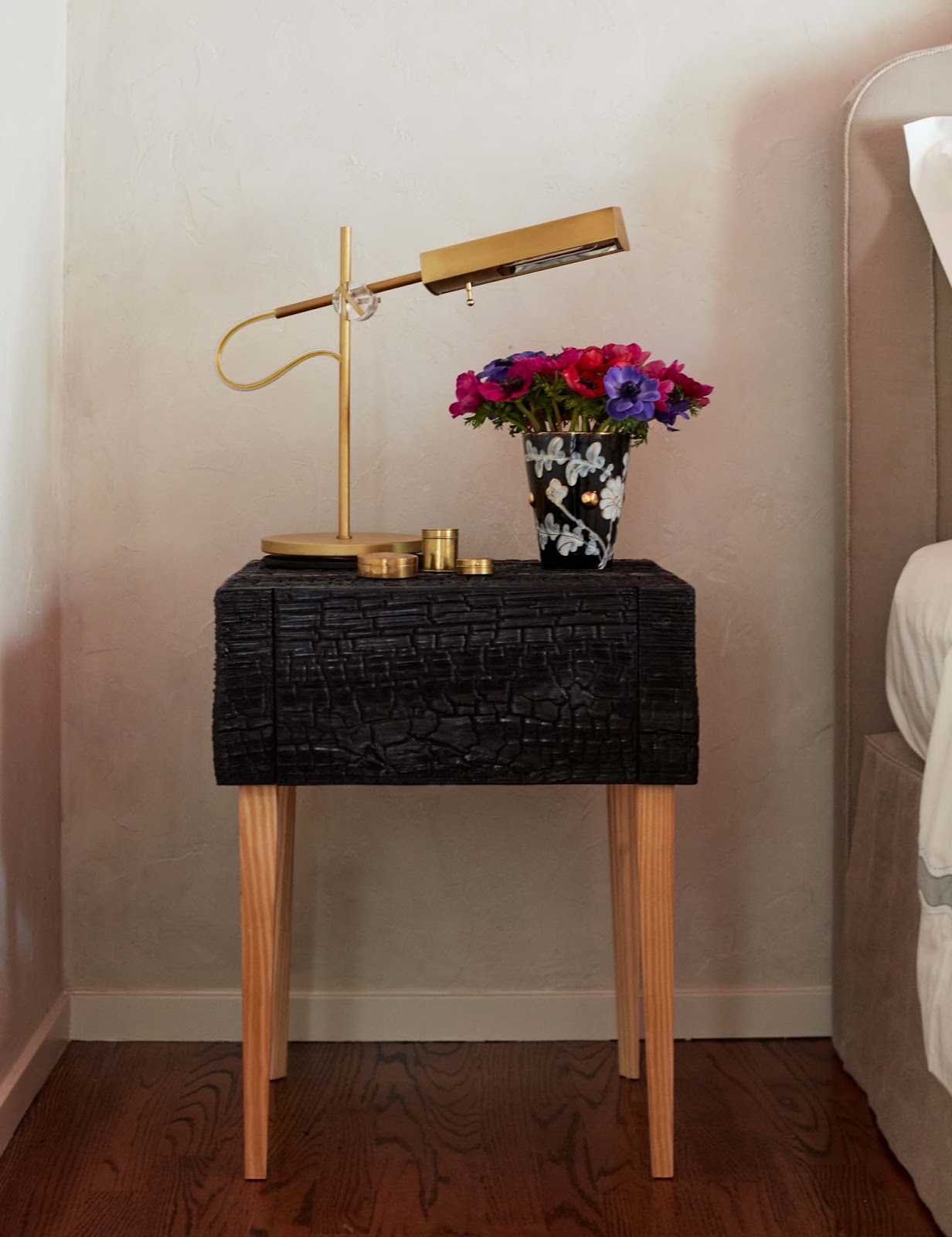 A modern interpretation of the ancient empire’s architecture and design, this space is infused with Roman-inspired elements; charred wood nightstands by Moran Woodworked Furniture recall the scorched beams in the town of Herculaneum caused be the eruption of Mt. Vesuvius.