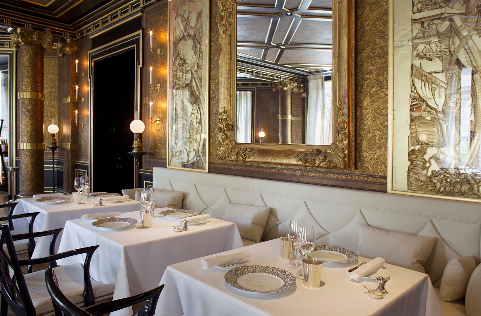 In the bar/lounge, Garcia and his team created an eighteenth-century décor with black-painted wood panels with gold detailing, along with emerald green Rubelli silk jacquard tufted sofas for the wine library. There’s a soothing Champagne tone on walls in the popular restaurant, with here and there some vivid flashes of gold, bronze and moss green.