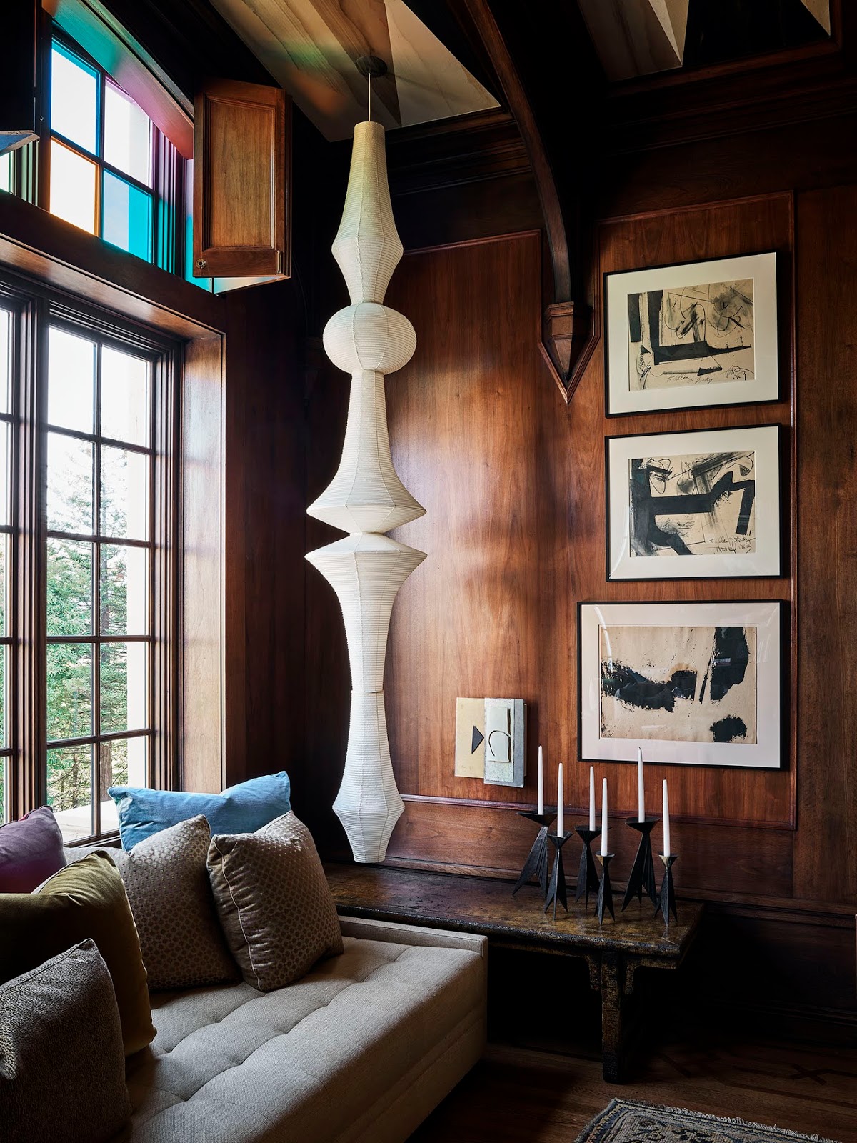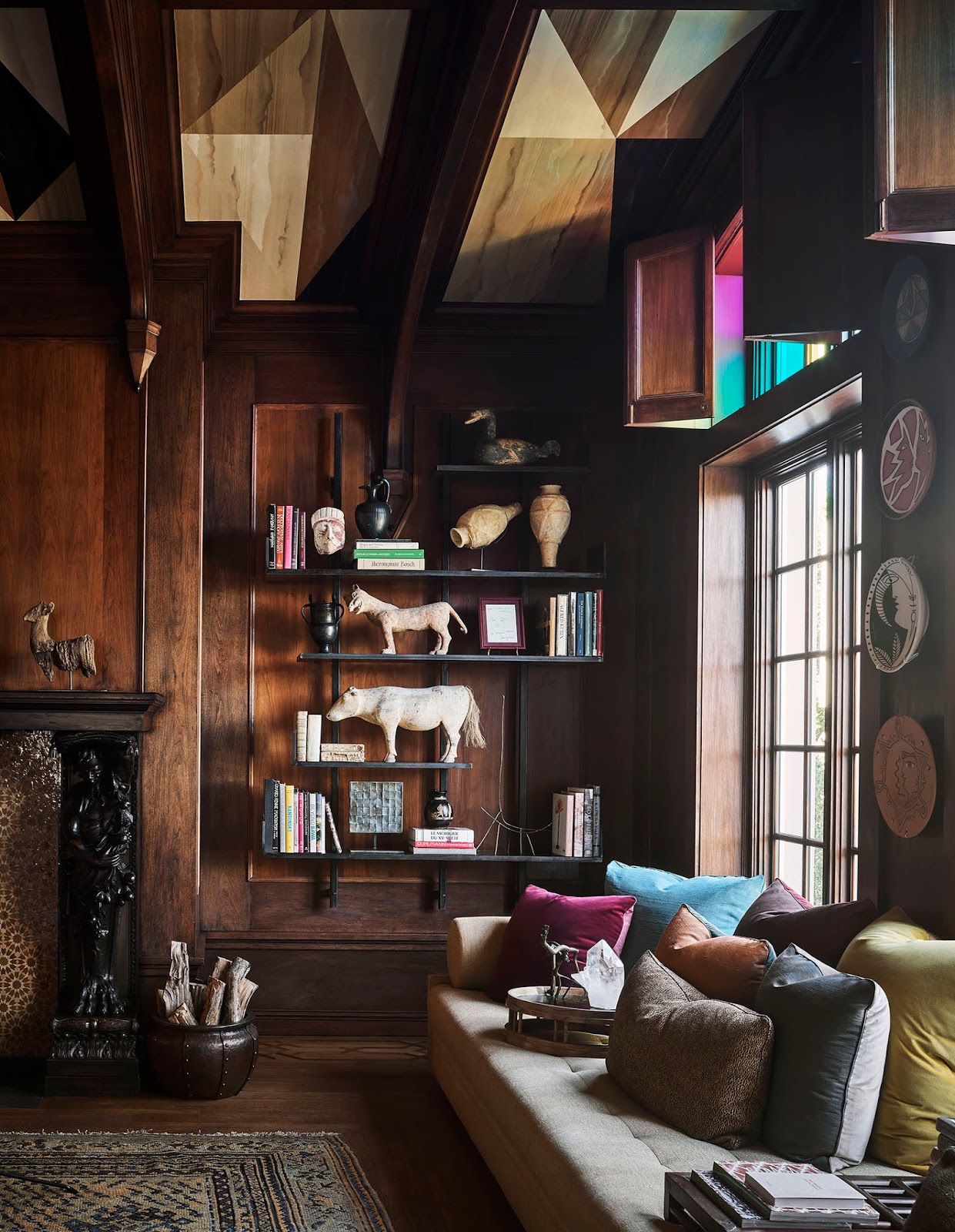 Paul and James have reshaped the room into an inspiring art-filled retreat/music room/study, rich with art collections, jewel colors, lavish textiles, and witty contrasts of materials, textures, and ideas. Hand-painted silk panels with a chic faux bois pattern add charm and interest to the ceiling beams. And Paul’s worldly collections of Han animals, sculptures, books, scrolls, paintings, and furniture (Ned Lutyens), and beautiful crafts give a sense of a multi-generation family room of cosmopolitan tastes.