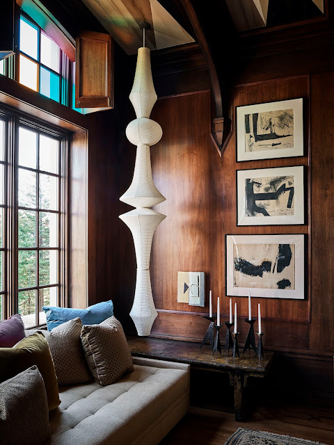 Layered in classical, contemporary, and custom furnishings and artwork, the hideaway features a statement antique Oushak carpet with an Edwin Lutyens octagonal table and chairs.
