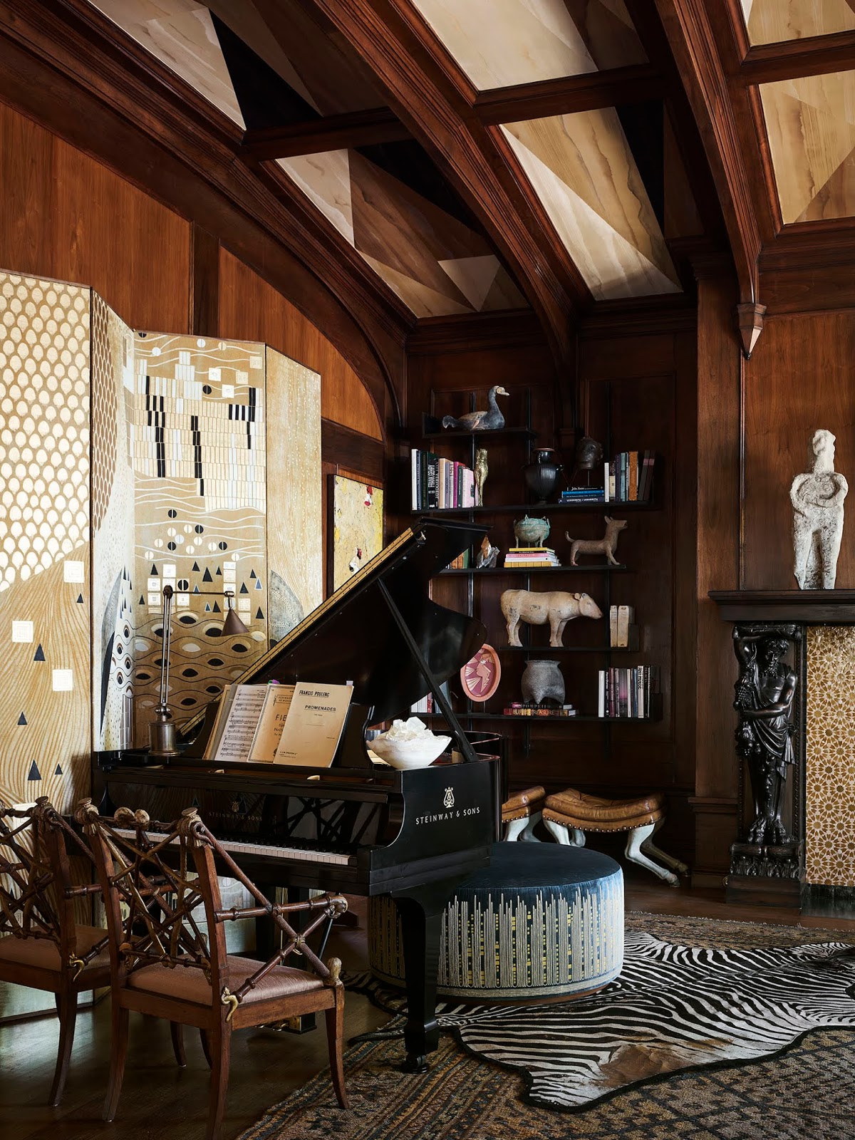 A custom geometric 5-panel velvet screen inspired by artist Gustav Klimt, a Steinway grand piano, a Ming Dynasty coffee table, and a window seat banquette in Jim Thompson woven fabric create a sense of maximalist eclecticism.