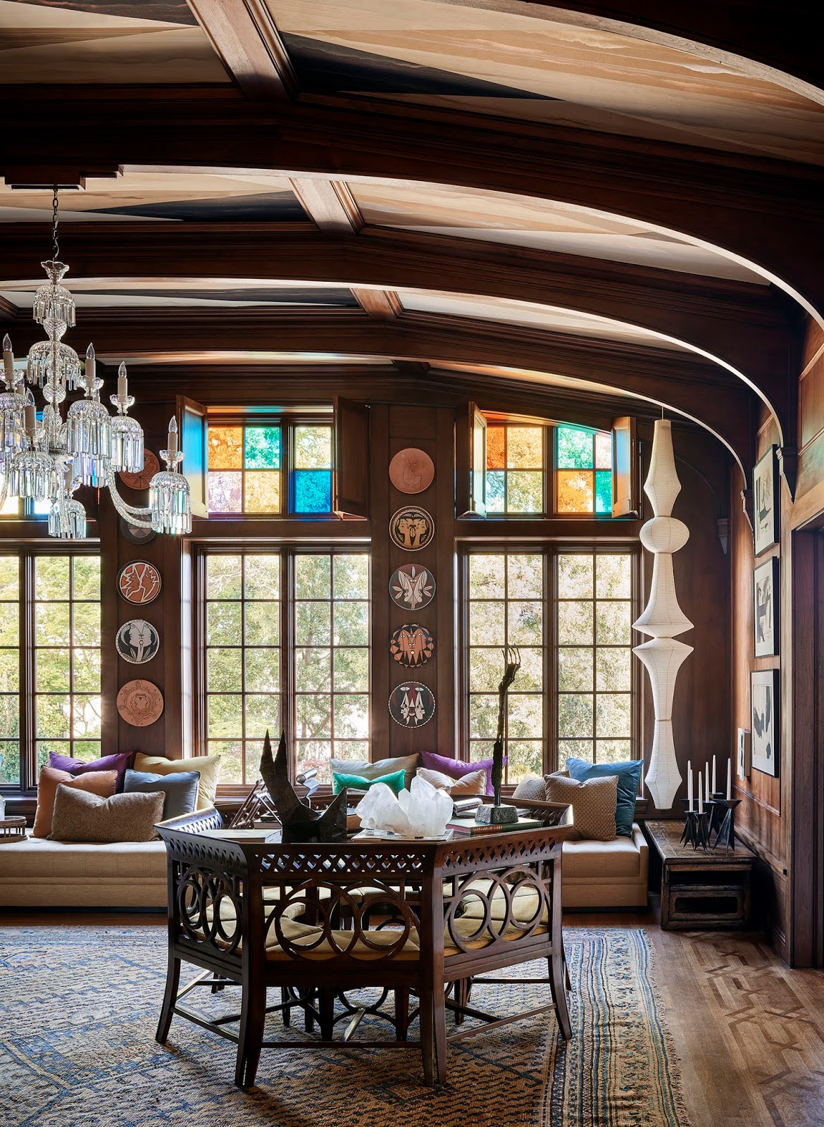 Layered in classical, contemporary, and custom furnishings and artwork, the hideaway features a statement antique Oushak carpet with an Edwin Lutyens octagonal table and chairs.