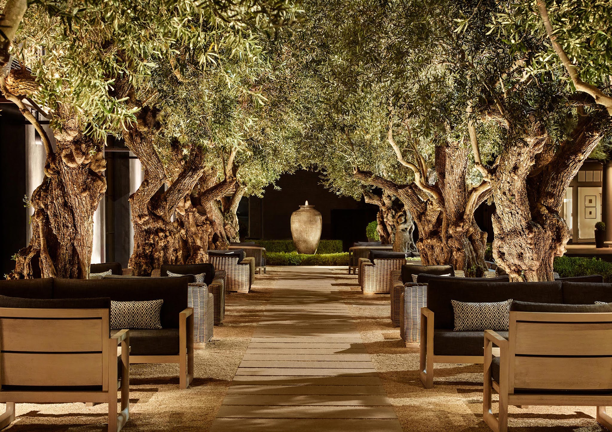 Seamlessly extending from indoors to out, the restaurant opens onto unobstructed views of Mount Tamalpais to the west and San Francisco Bay and its wetlands to the east. The concept of classical trees and seating areas was influenced by the great classical gardens of Europe.