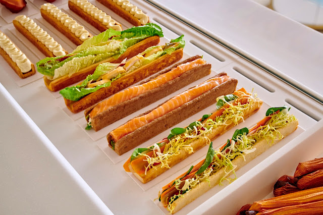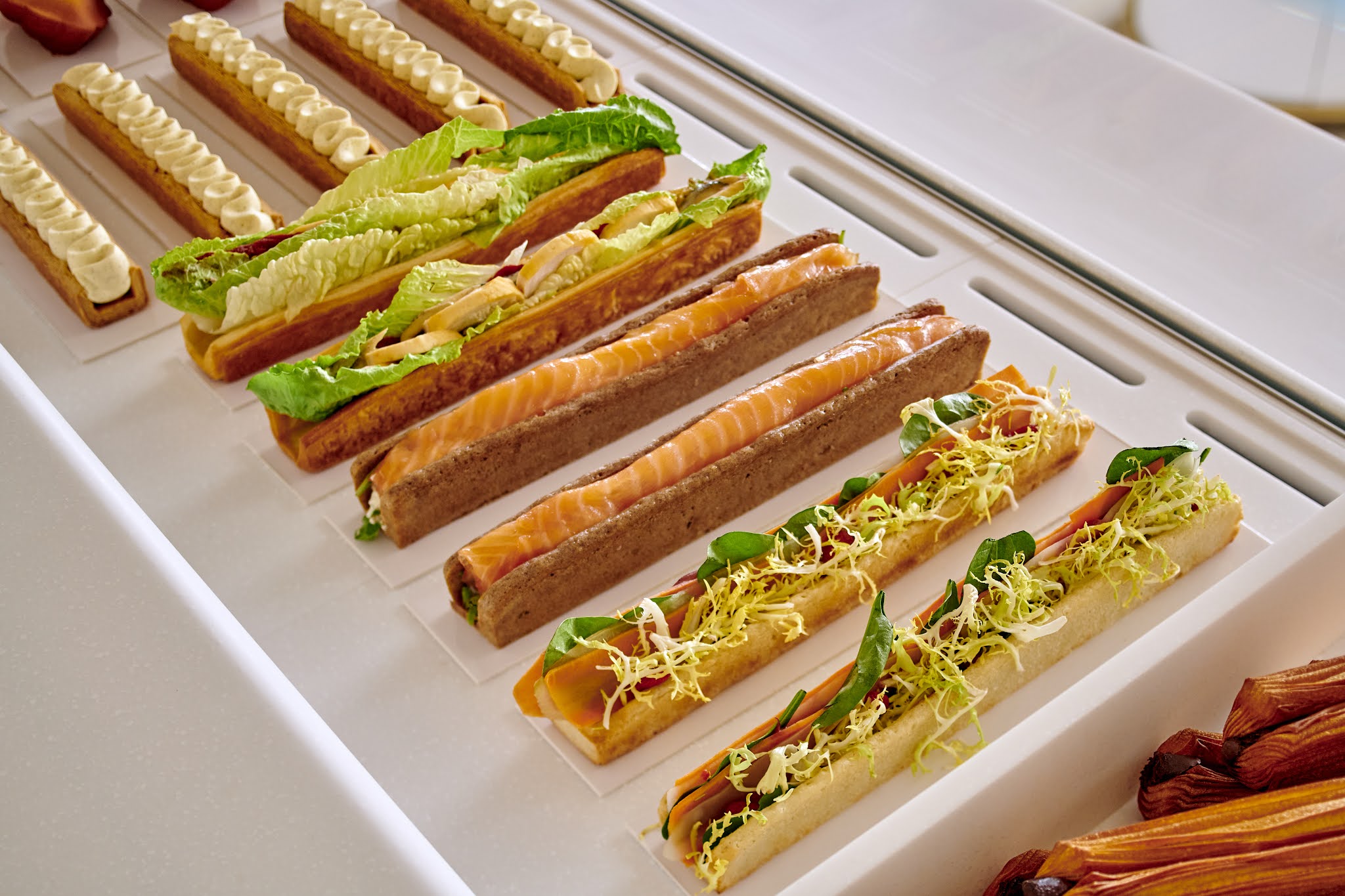 The lunchtime sandwich is available in three elongated variations: the César – inspired by the salad, Perret-style; the Salmon, in a more traditional version with fluffy sliced bread, and the Vegan, a focaccia sandwich with character.
