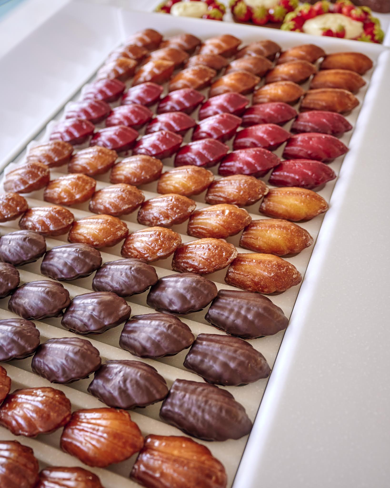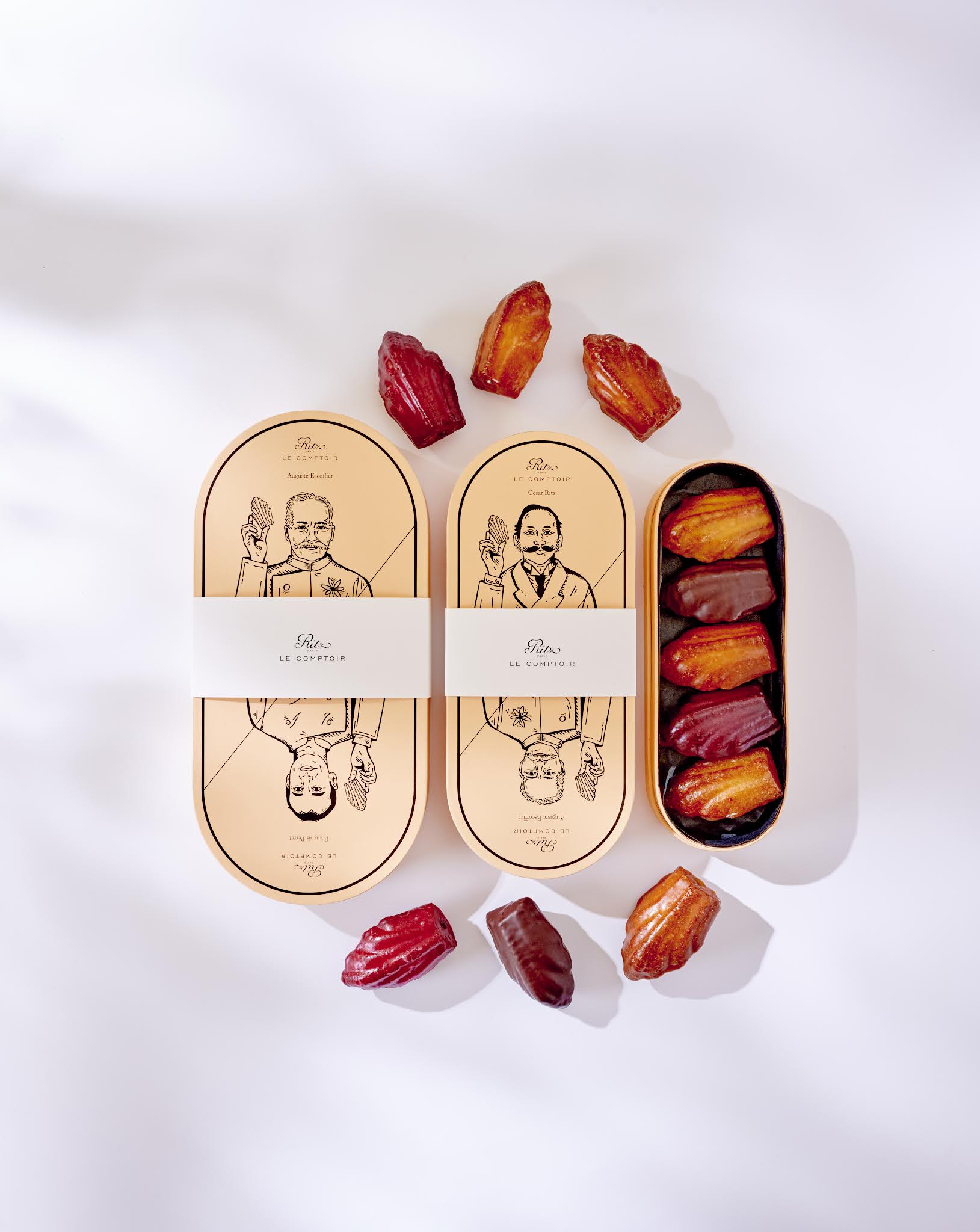 There follow François Perret’s iconic treats: madeleines in multiple variations with fruit confit (raspberries, passion fruit, etc...) to take away or offer in pretty boxes illustrated with the likeness of César Ritz and Auguste Escoffier; marble cake, tartlets, the Ritz au lait, the chocolate bar.