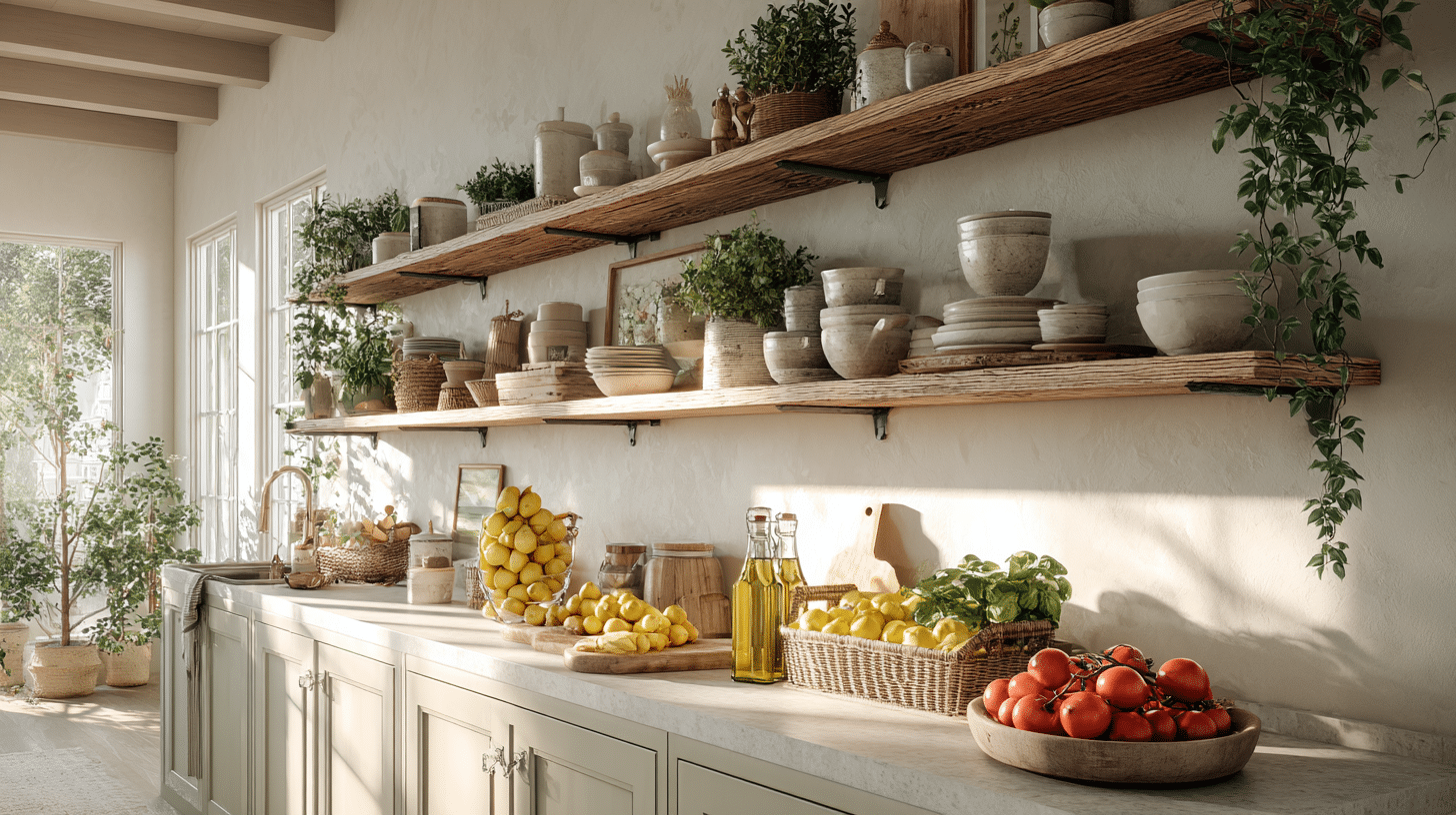 Mount an open wooden shelf for fresh produce that doubles as kitchen art: tomatoes, lemons, and garlic braids bring natural color pops. Weathered wood adds character, stained pine adds warmth.