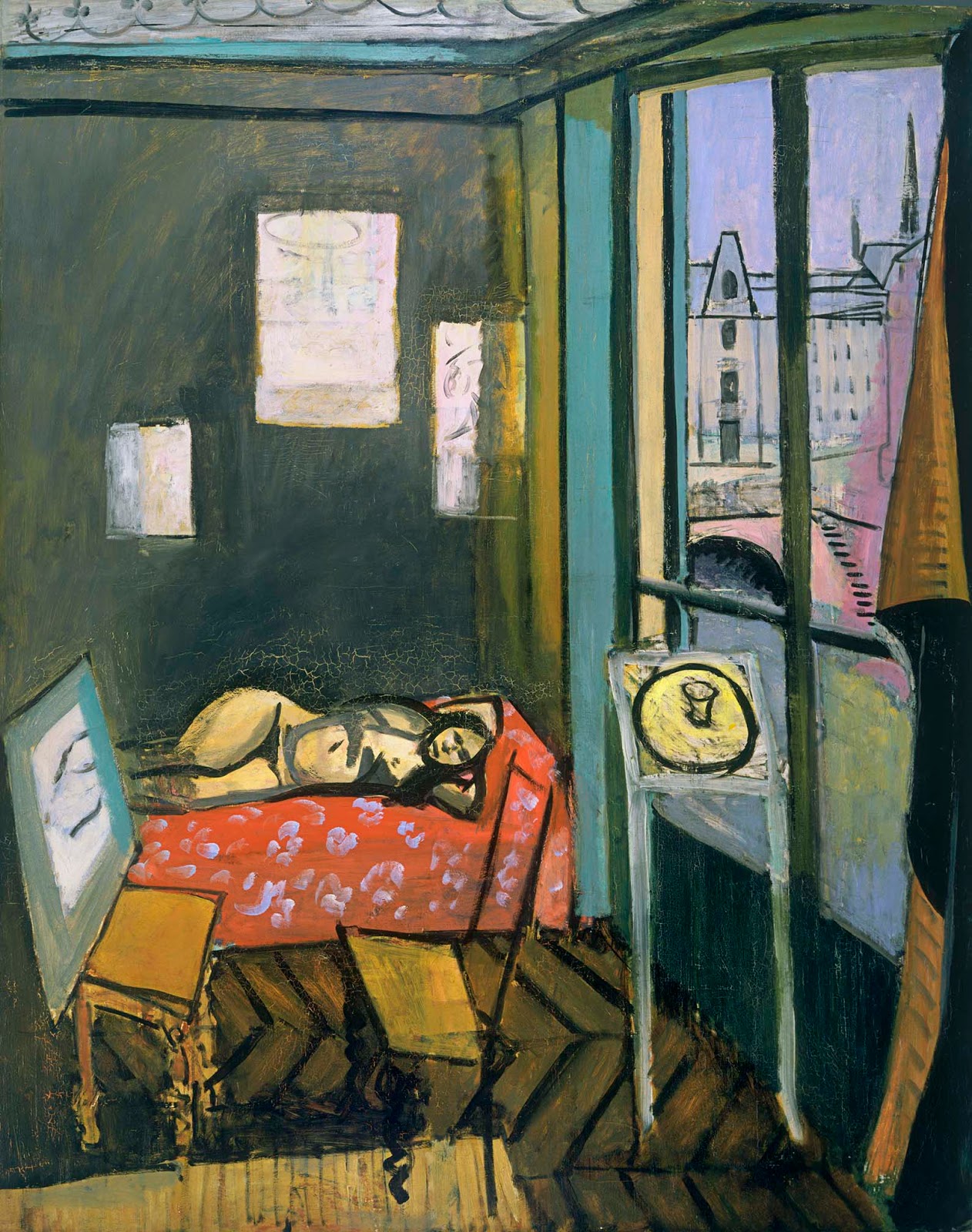 The bedroom conveys a restful, feeling. The carpet, from Mark Nelson Designs, is pale blue and cream woven wool, which is very flat but also very soft. The walls are covered in a Kneedler|Fauchère linen wallpaper, which is subtle in tone, but adds a great dimension and texture.