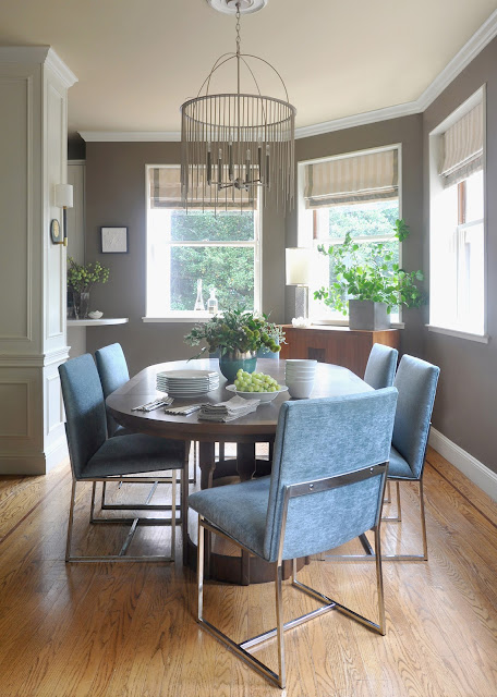 In the dining room, vintage Milo Baughman chairs from 1stDibs were recovered in Pollack speckled 'tidal pool' velvet, which I absolutely love. They sit around a vintage 1960s walnut table from Brown Saltman and underneath a birdcage-style chandelier by Avrett, a custom lighting studio in Charleston, South Carolina. Some people may recognize that fixture from my 2012 San Francisco Decorator Showcase room…the benefit of doing showcase rooms is that some items eventually find their way into designers’ own homes!