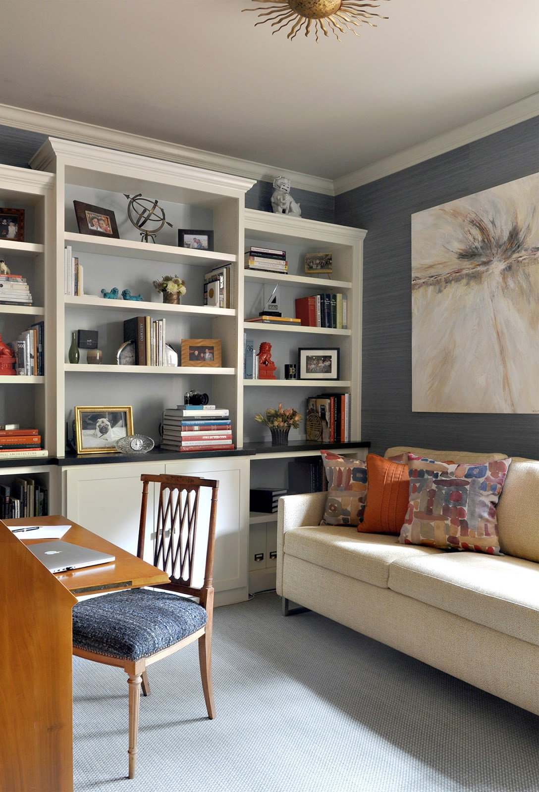 The study is the smallest room in the apartment so I went bolder with color and wallpapered the walls in a wonderful textured blue grasscloth — 'Broadway Blues' by Phillip Jeffries. It’s one of my favorite elements in the entire apartment and contrasts well against the white bookcases. On the loveseat, covered in a pale gold Glant fabric, multi-color patterned pillows in a watercolor motif fabric by Thomas O’Brien for Lee Jofa accompany an orange felt pillow.